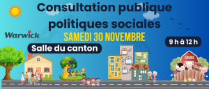 La Ville de Warwick convie toute sa population à une consultation publique le samedi 30 novembre 2024, entre 9 h et midi, à la Salle du Canton de Warwick.