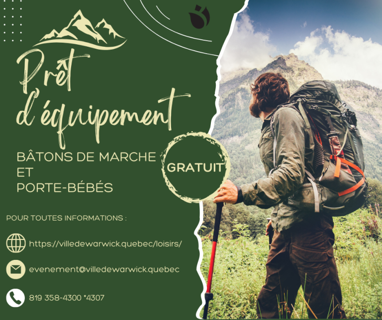 La Ville de Warwick offre aux citoyens de la municipalité la possibilité d’emprunter des bâtons de marche (4 paires disponibles) et des porte-bébés (2 disponibles), et ce, tout à fait gratuitement.
